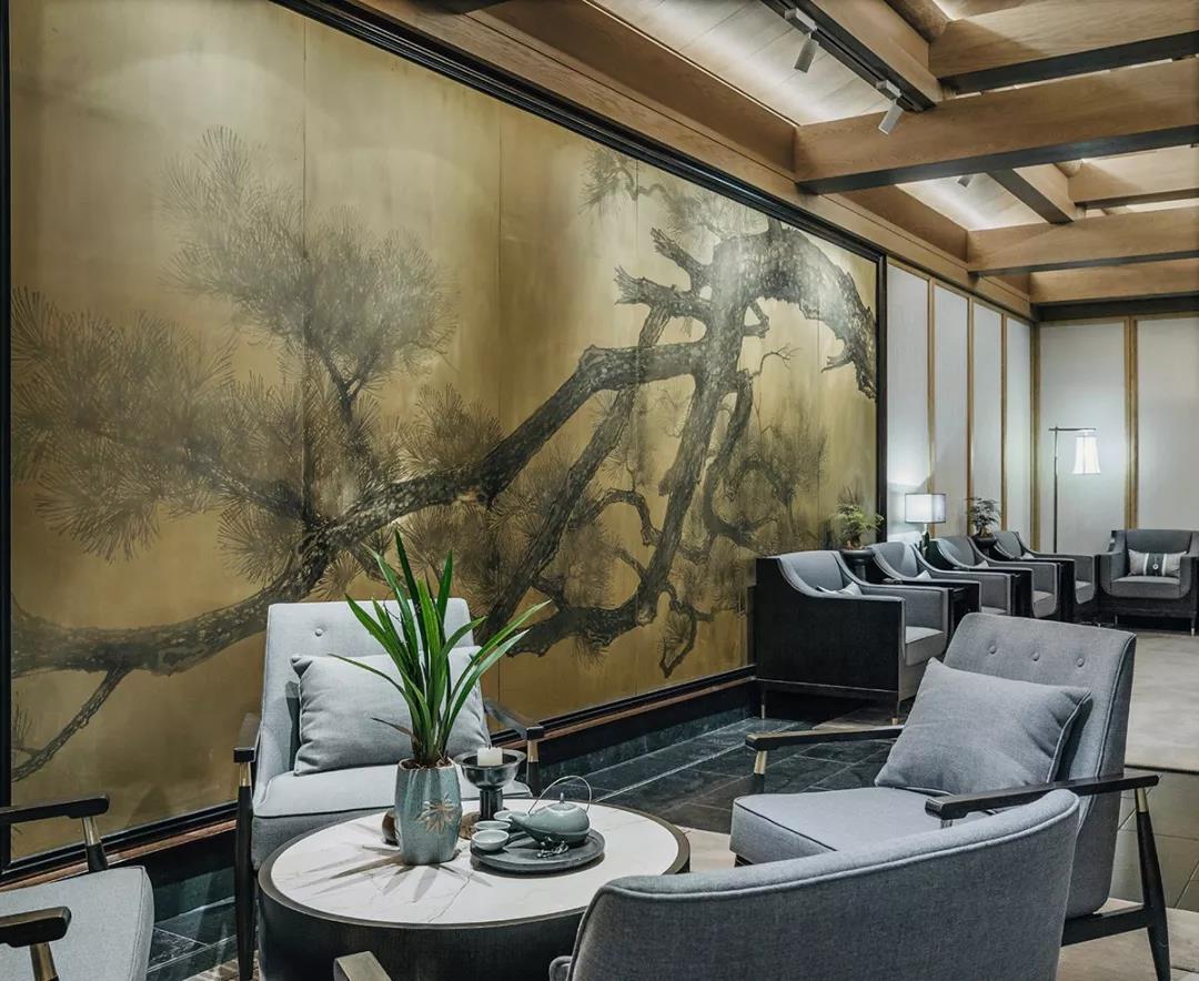“寓言假物,不取自白”,背景墻畫蒼松挺勁,生機(jī)勃勃,帶給人無限力量。