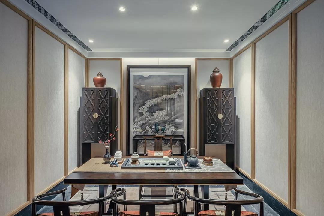 山水林間,云霧繚繞背景墻的營造,不同元素之間的相互重組融合,以此帶來更加融合新中式的庭院風(fēng)采,室內(nèi)和室外的設(shè)計(jì)元素的運(yùn)用相互貫通,保留著新中式住宅的神韻和精髓。