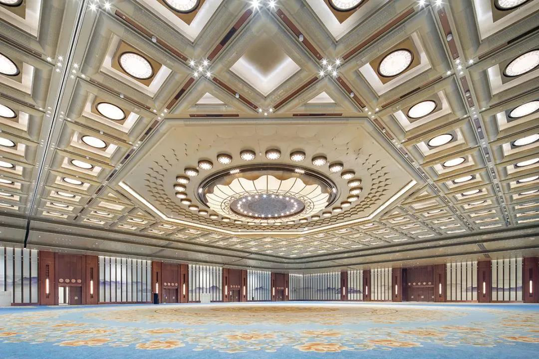 地面整體花團錦簇的手工羊毛毯與天花“芙蓉王國盡朝暉”的主題遙相呼應,材質上,天花立面都采用了金屬鋁板、銅板,總體空間造型更符合建筑聲學反射的構造需求,隱含主次同時便于分割使用,色彩典雅溫和,層次井然有序,尺度震撼,現(xiàn)代而又不失莊重。