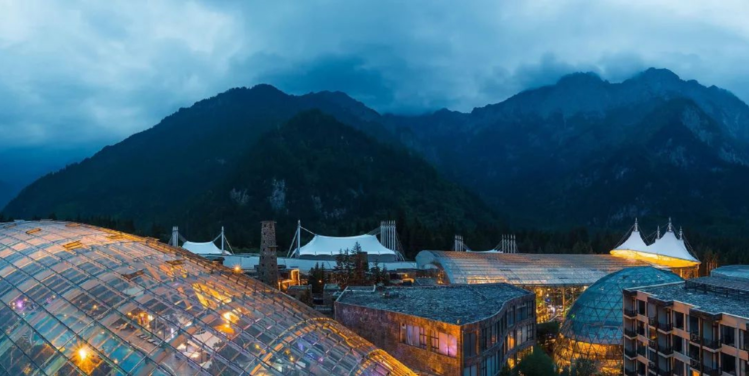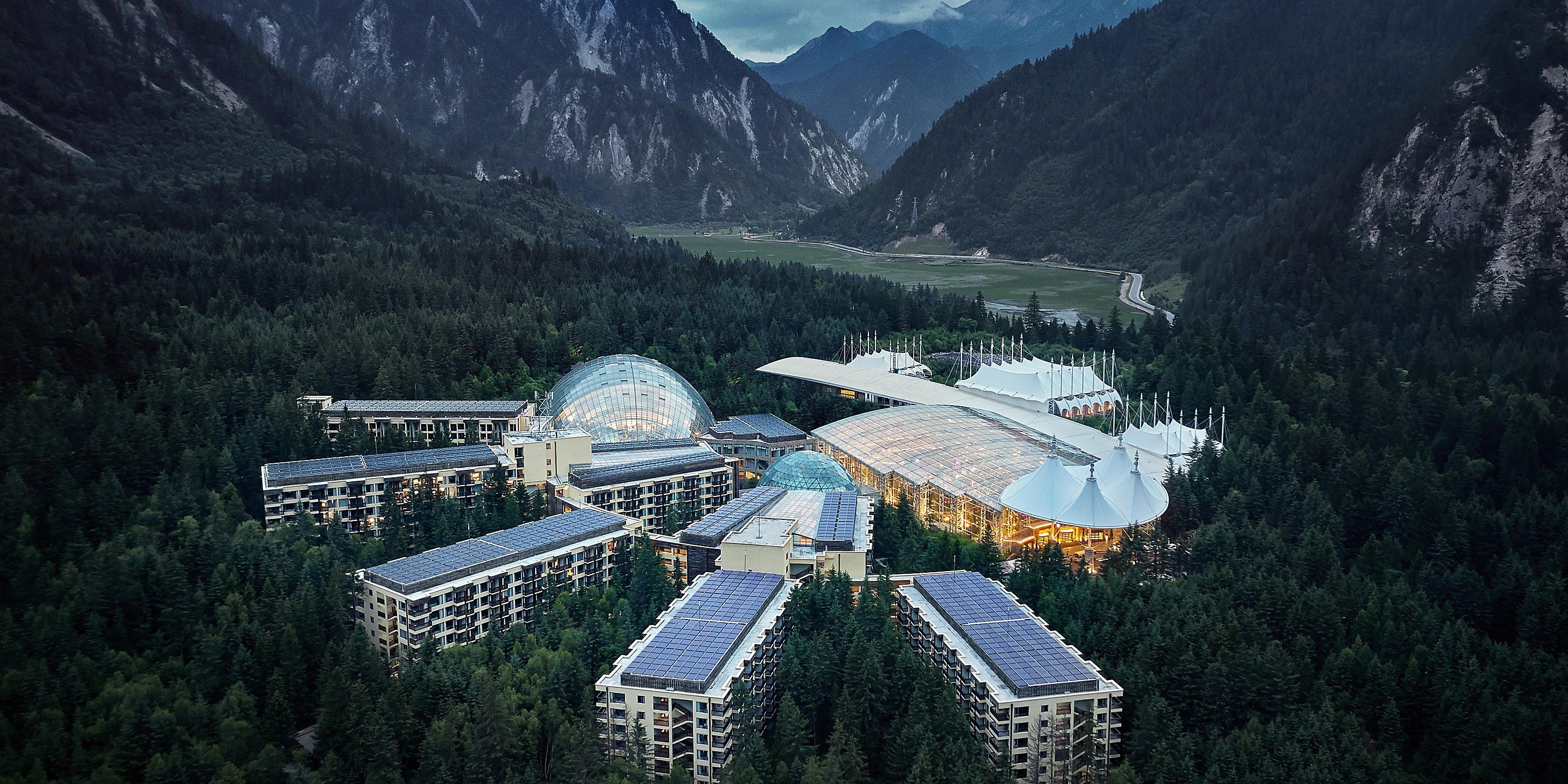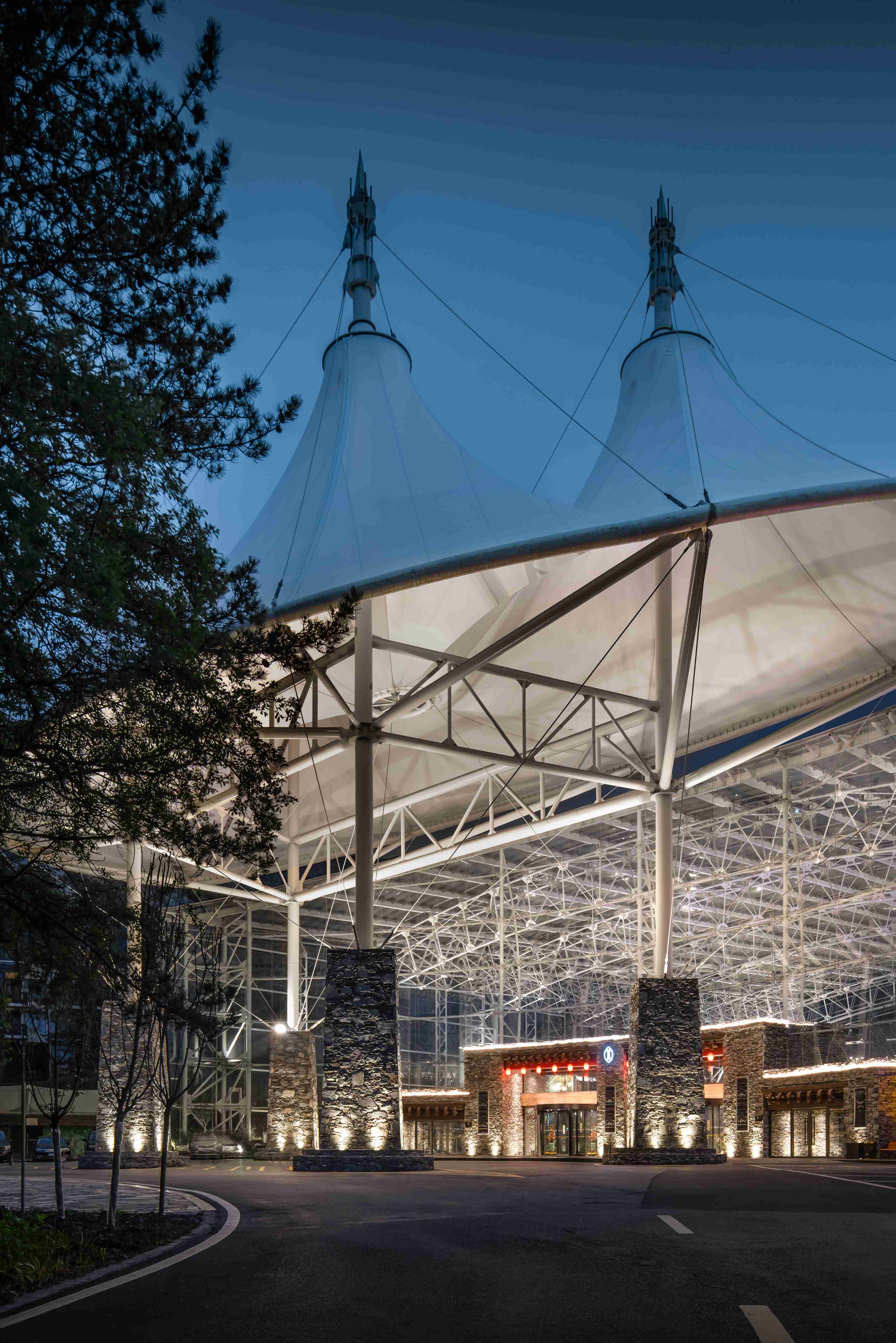 建筑群背靠雪山,掩沒于原始森林之中,以群山環(huán)繞、綠樹蔽日、碧水流淌的自然環(huán)境,配置全球一流的、前衛(wèi)的建筑形式,使客人在享受高檔硬件條件的同時,通過被譽(yù)為"消失的建筑" Disappeared architecture的透明的全玻璃頂建筑,容身心于藍(lán)天白云森林綠樹之間。森林別墅依山傍水,遠(yuǎn)瞻皚皚雪山,前眺碧海草甸,自然環(huán)境美妙絕倫。鋼拱架全透明玻璃結(jié)構(gòu)的10000平方米大堂、10000多平方米的溫泉中心、會議中心及各色餐廳、酒吧、古羌寨結(jié)合在一起,像一片花瓣,飄落在森林中。(九寨天堂洲際大酒店連續(xù)兩年被評為"中國十大最受歡迎度假酒店",獲"金枕頭"獎,且通過"綠色環(huán)球21"認(rèn)證的酒店)