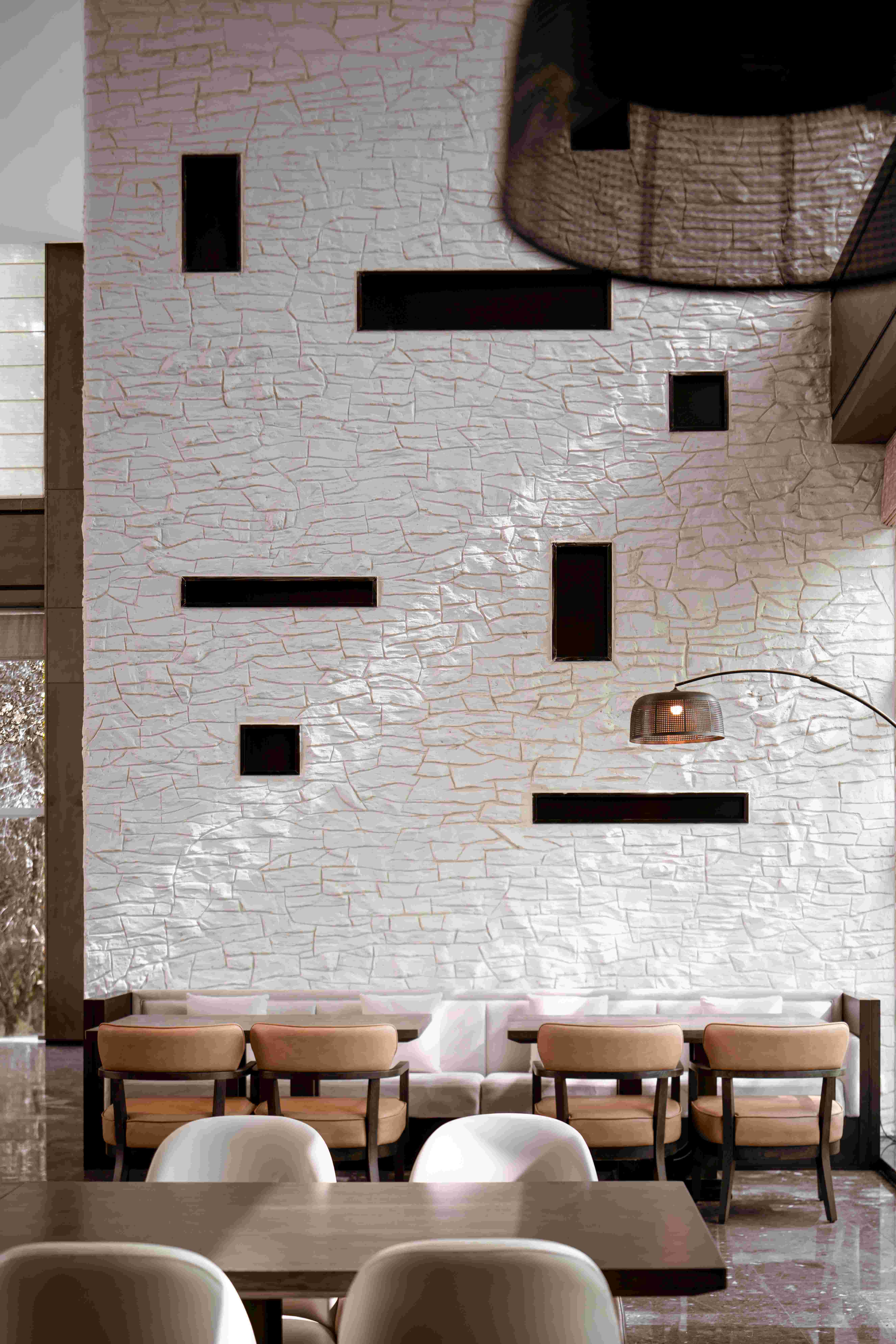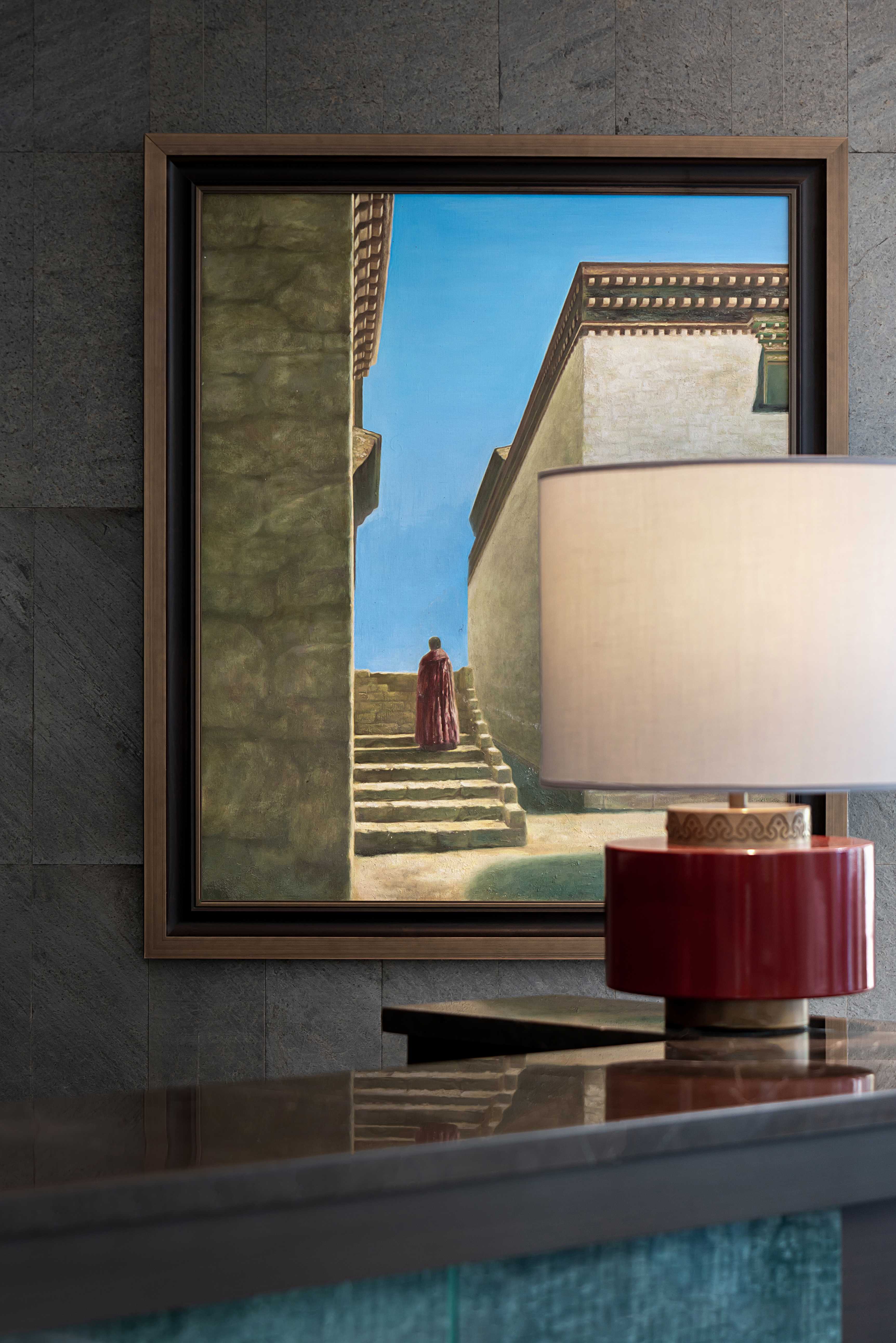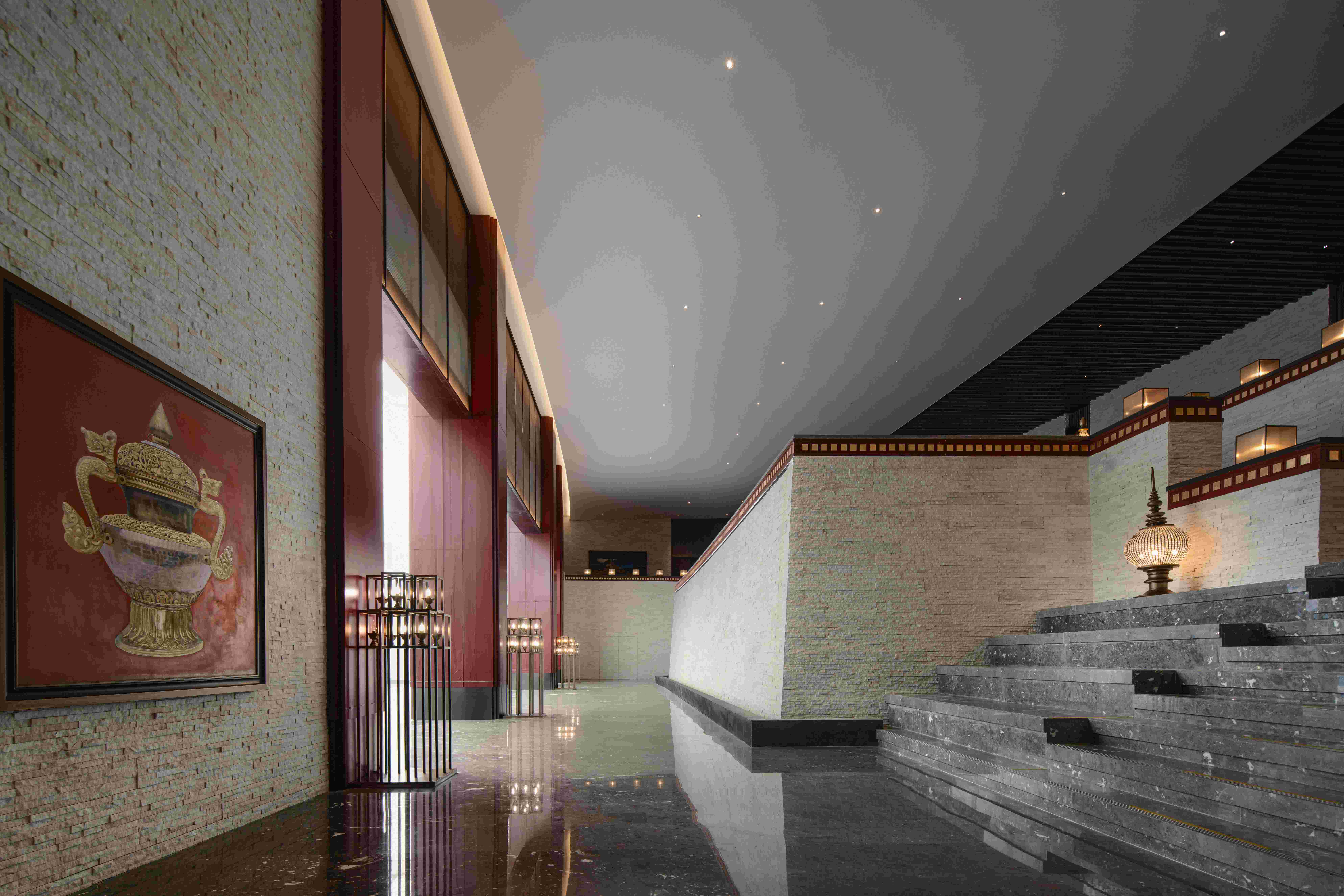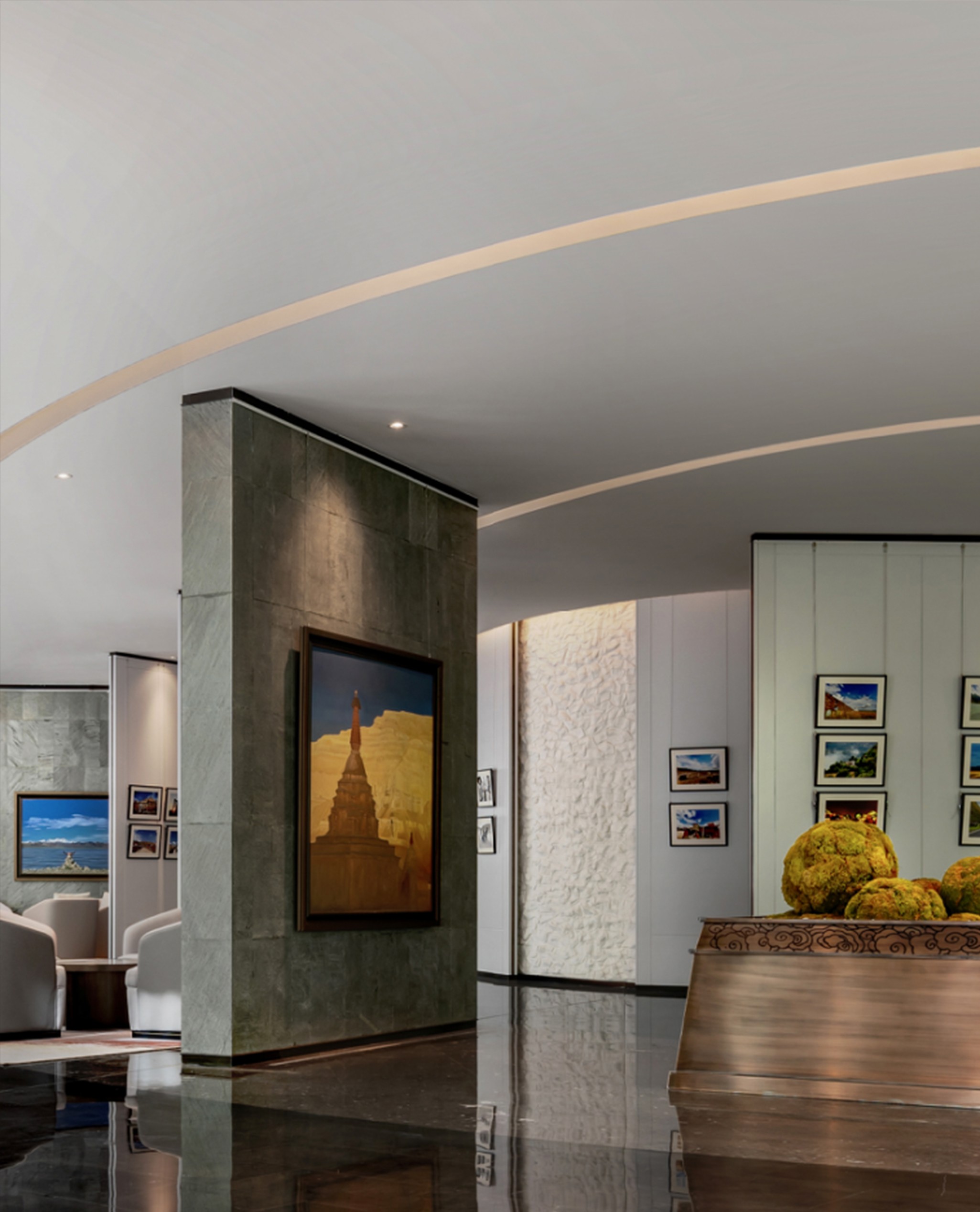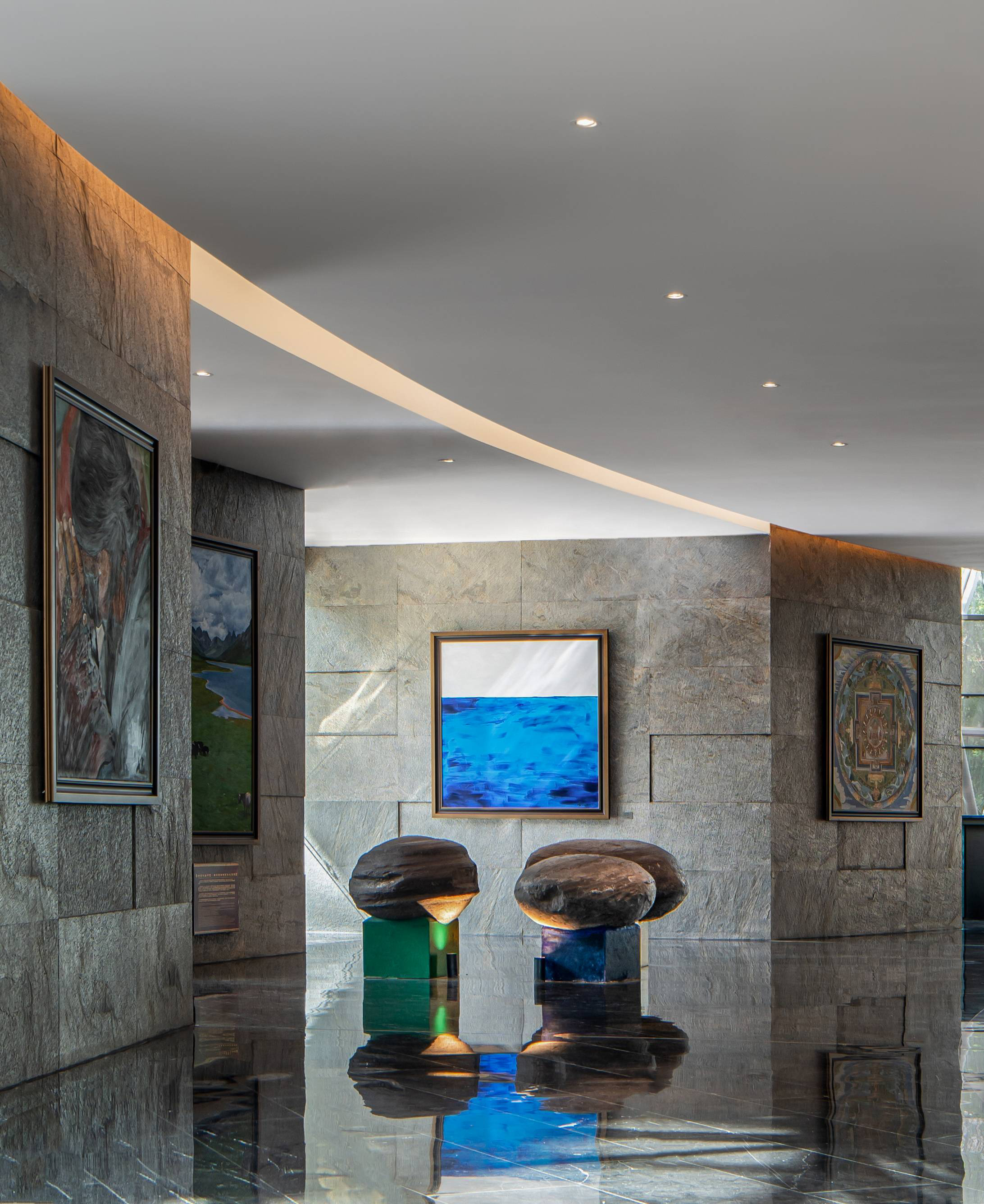 天然質(zhì)感薄石材墻、藏式邊瑪墻融合藝術(shù)畫廊。
