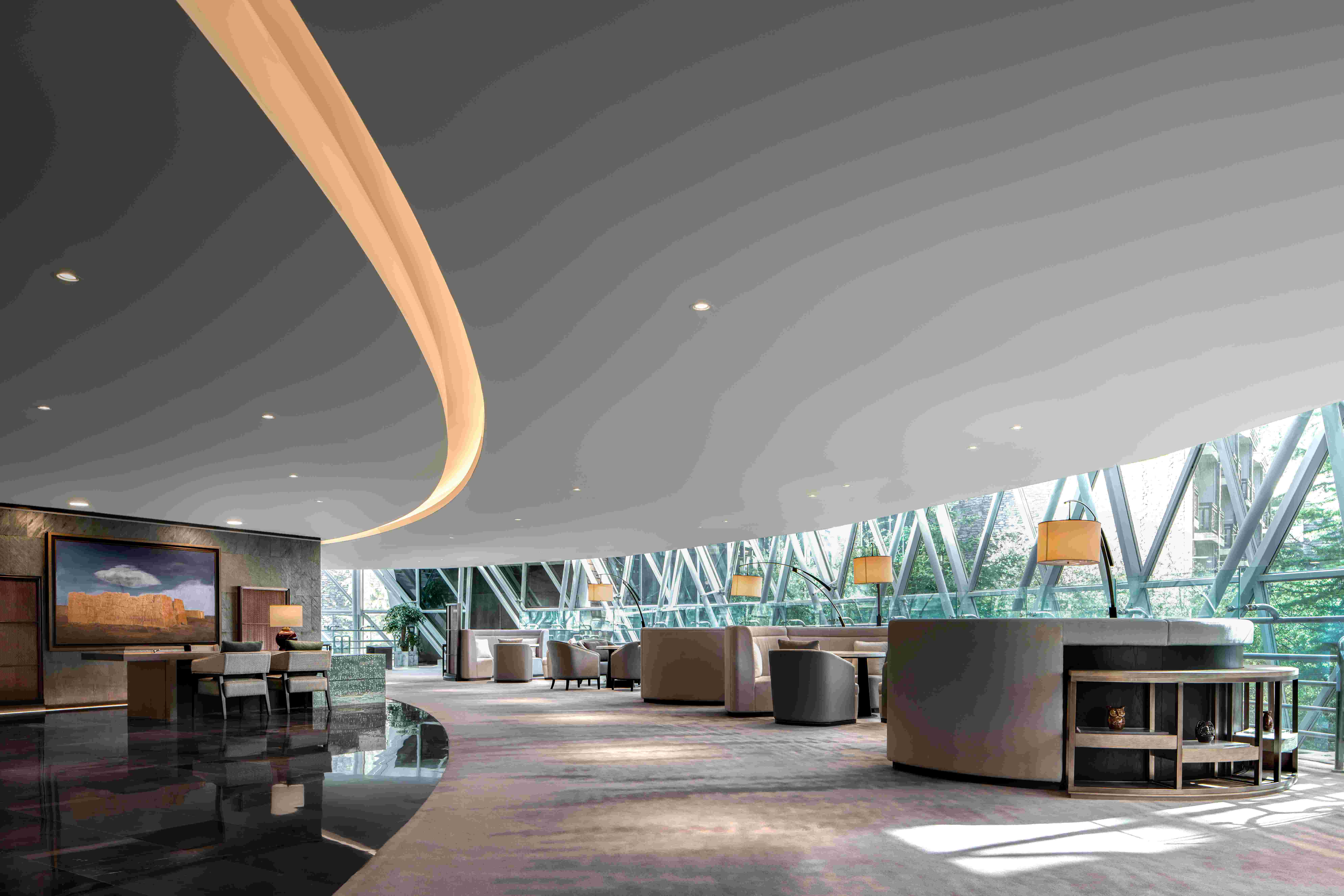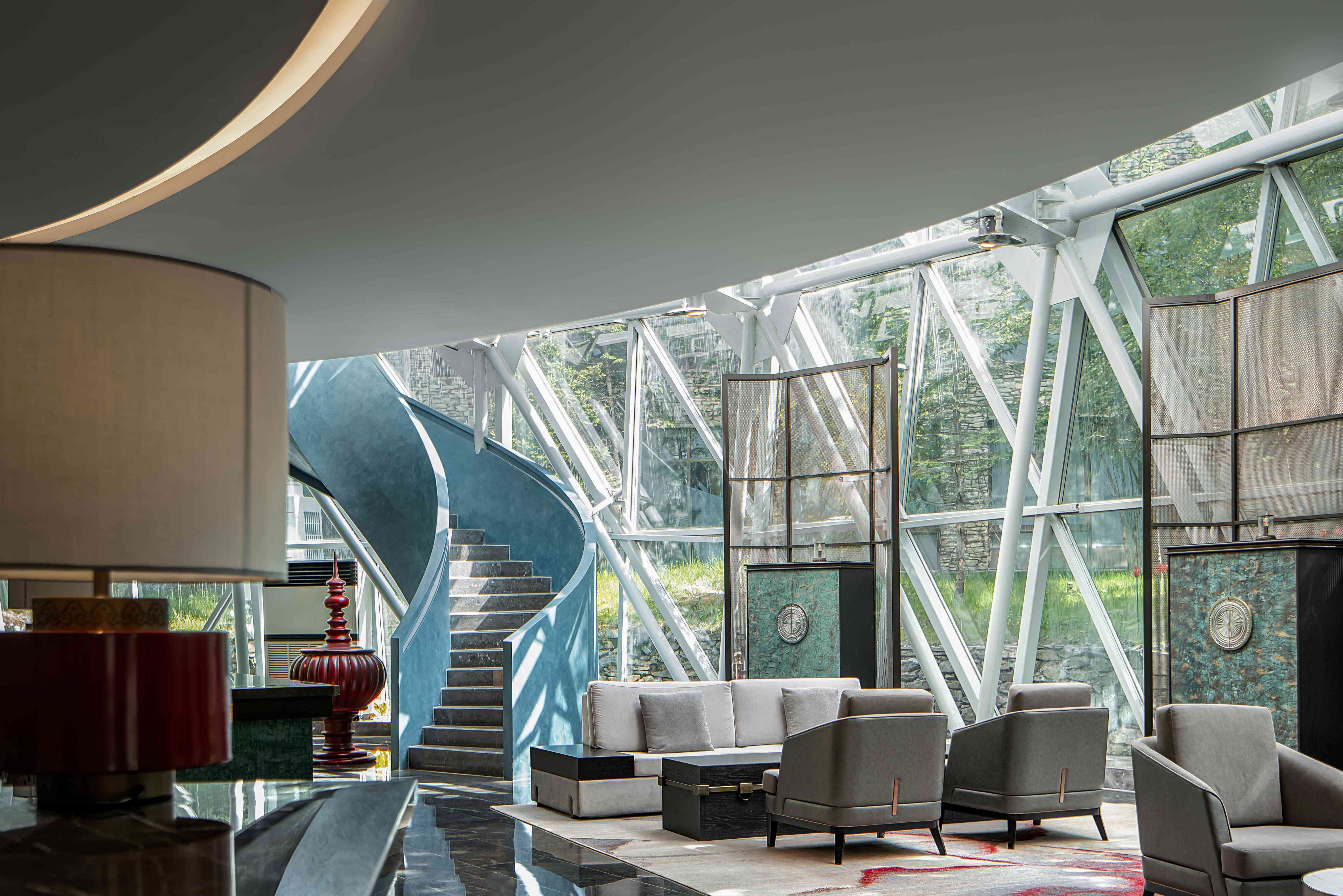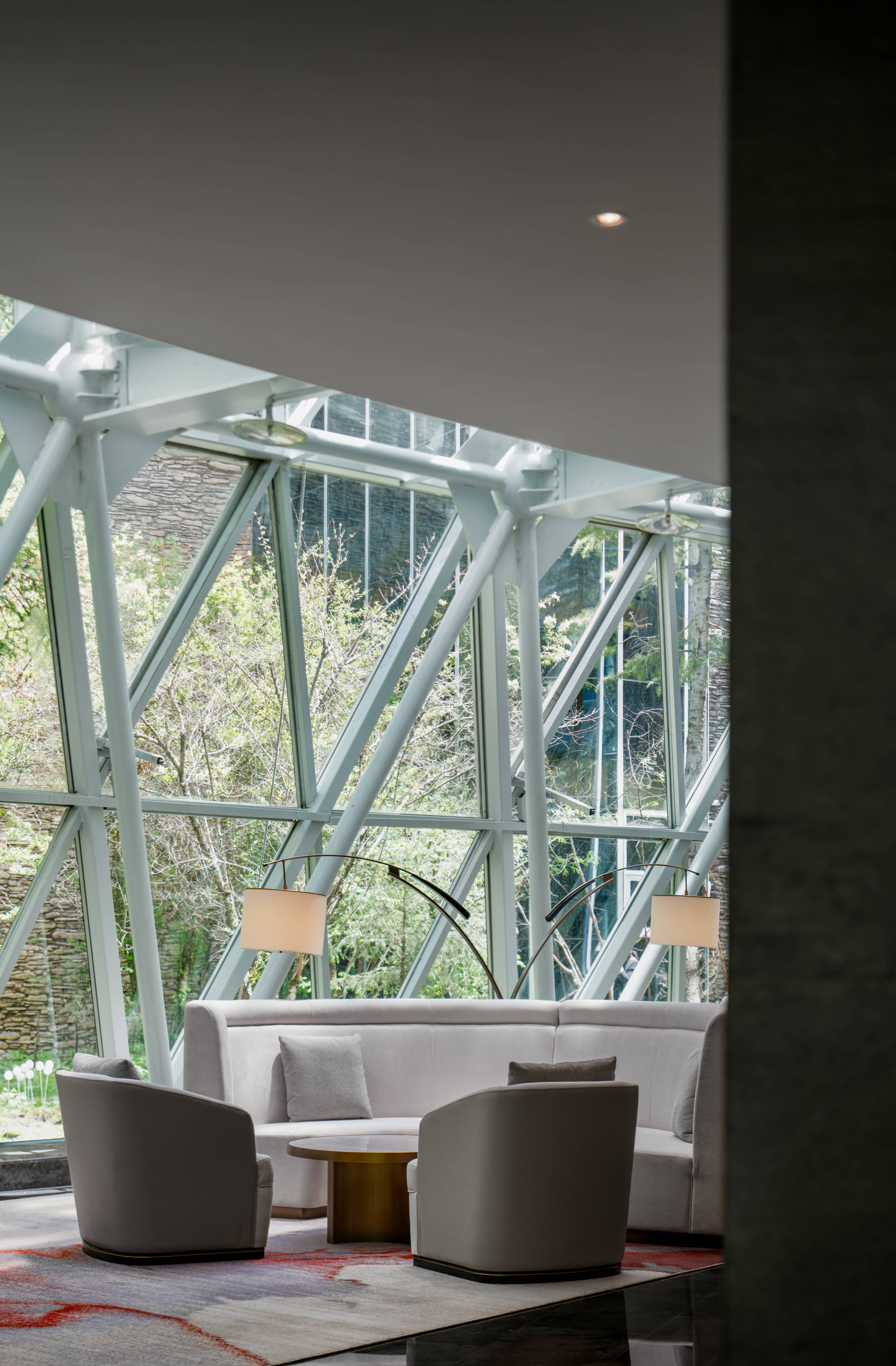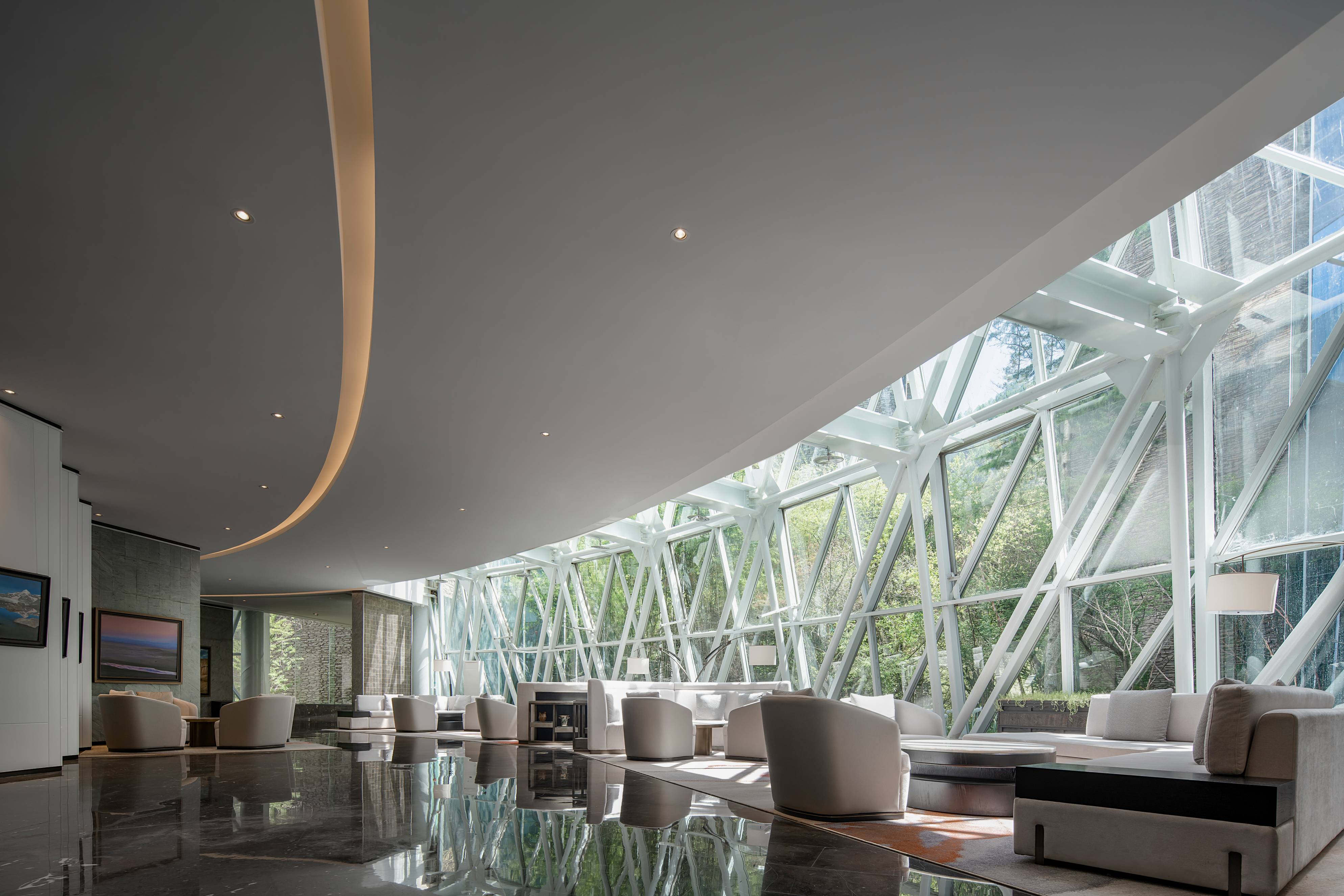 大堂休息區(qū)布置在景色最好的區(qū)域,這里被自然森林所環(huán)抱,不同的時節(jié)可感受不同的風(fēng)景。