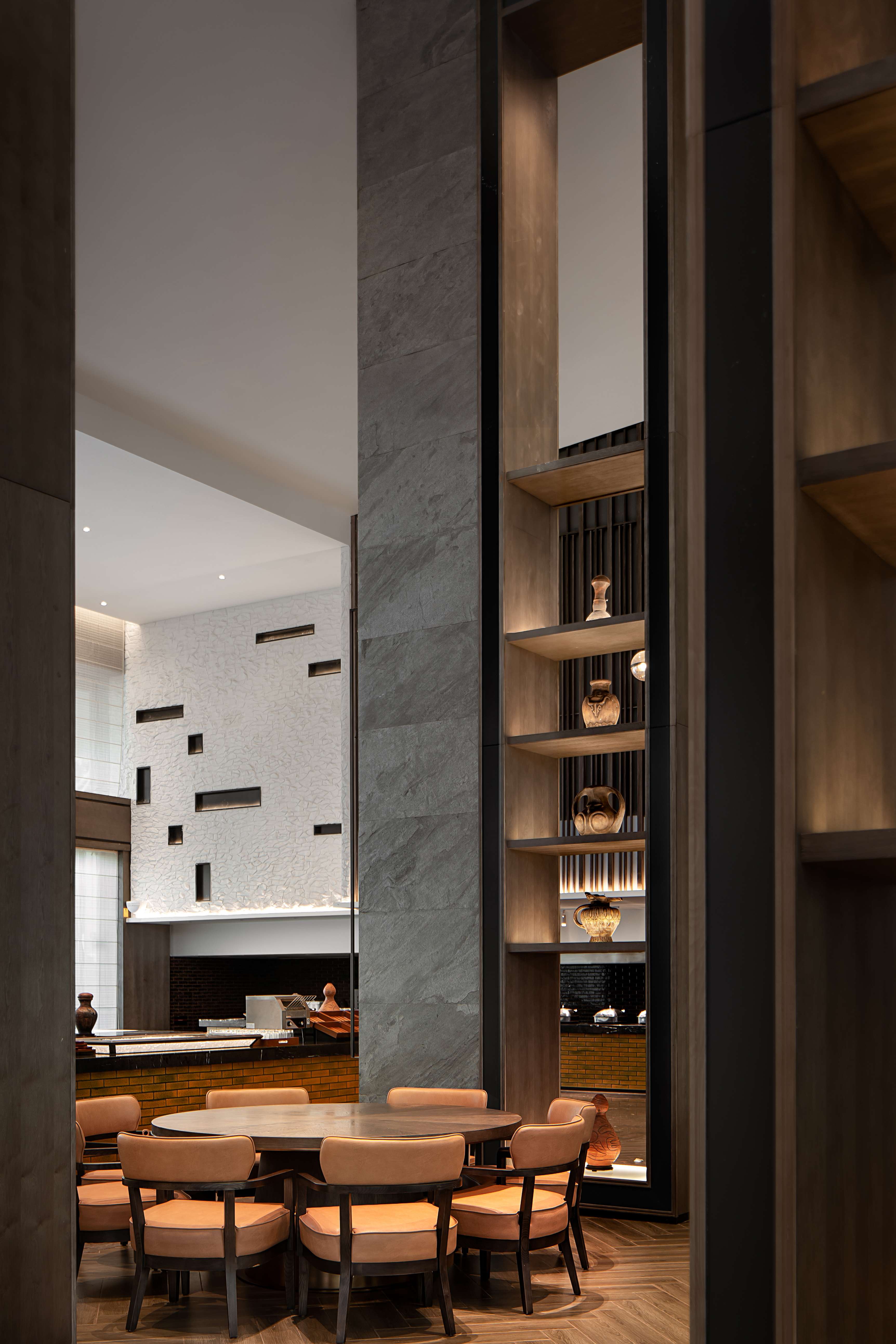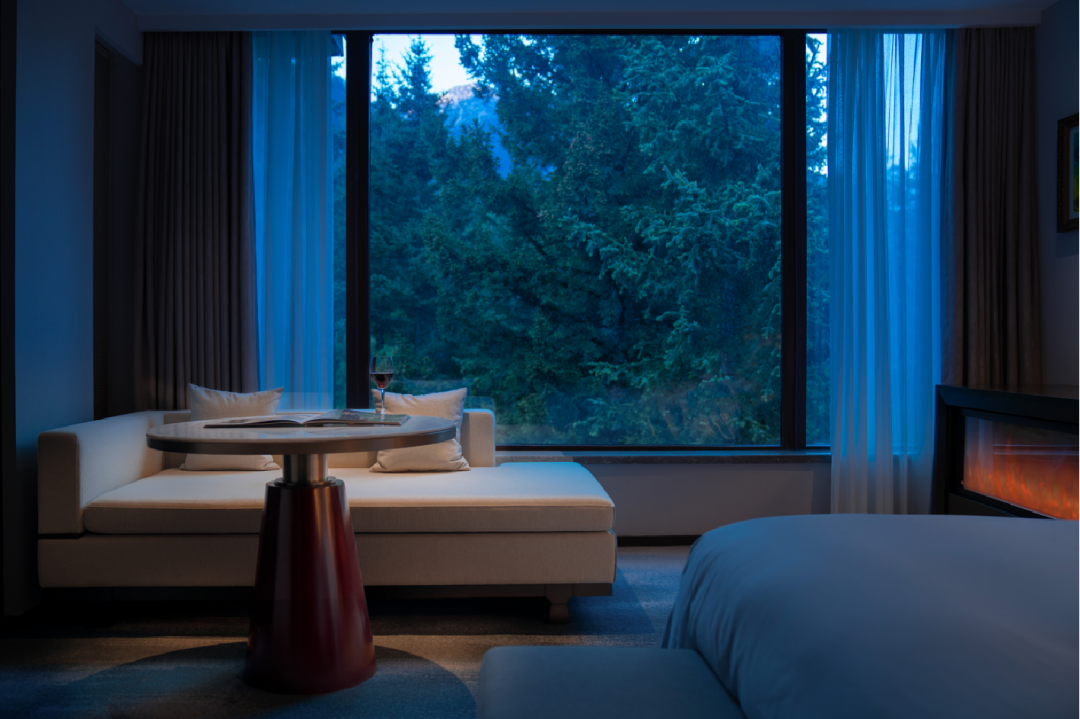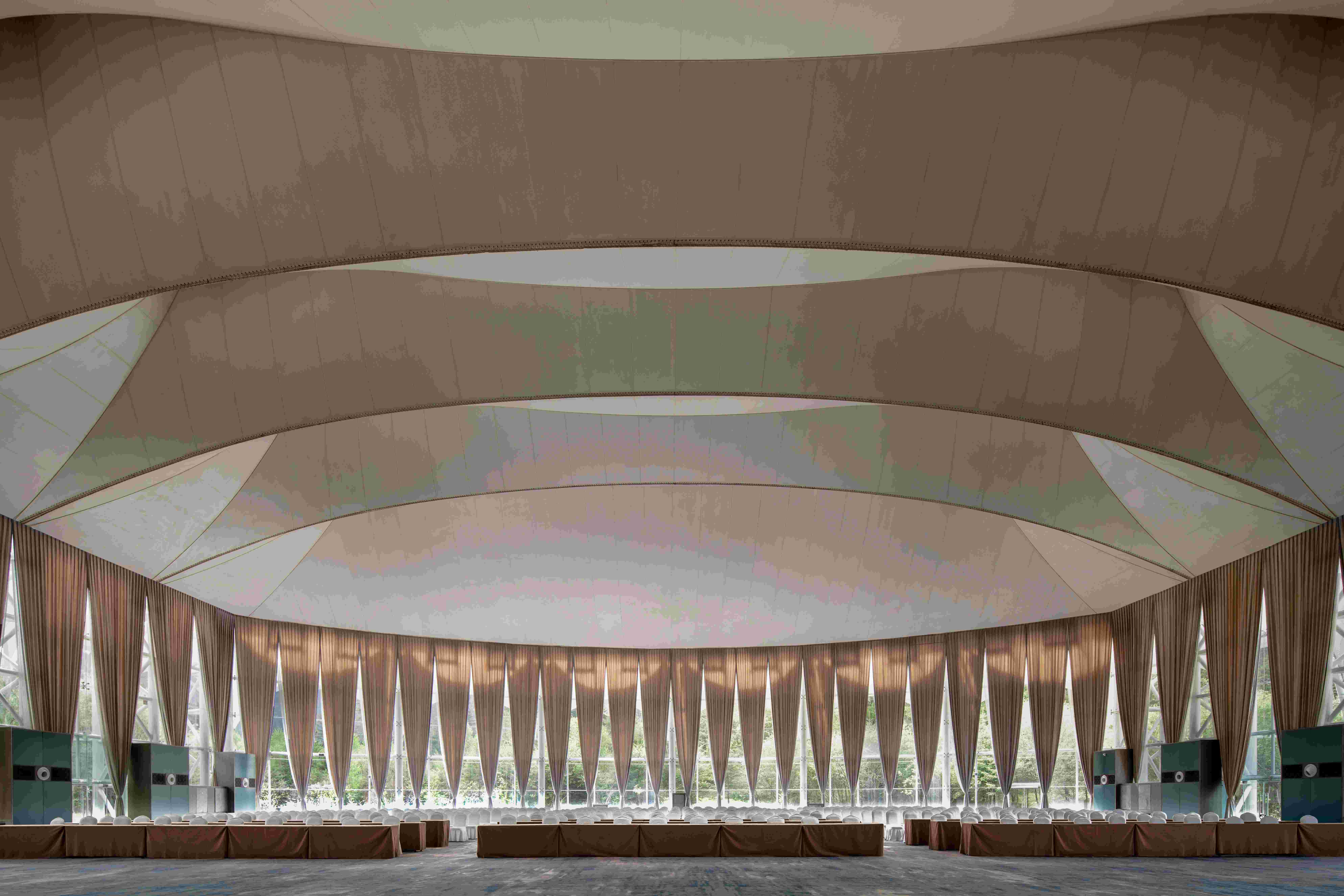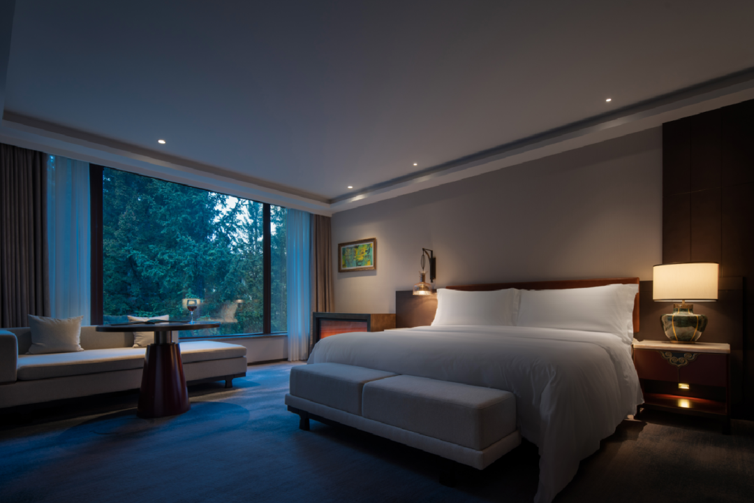 大堂休息區(qū)布置在景色最好的區(qū)域,這里被自然森林所環(huán)抱,不同的時節(jié)可感受不同的風(fēng)景。