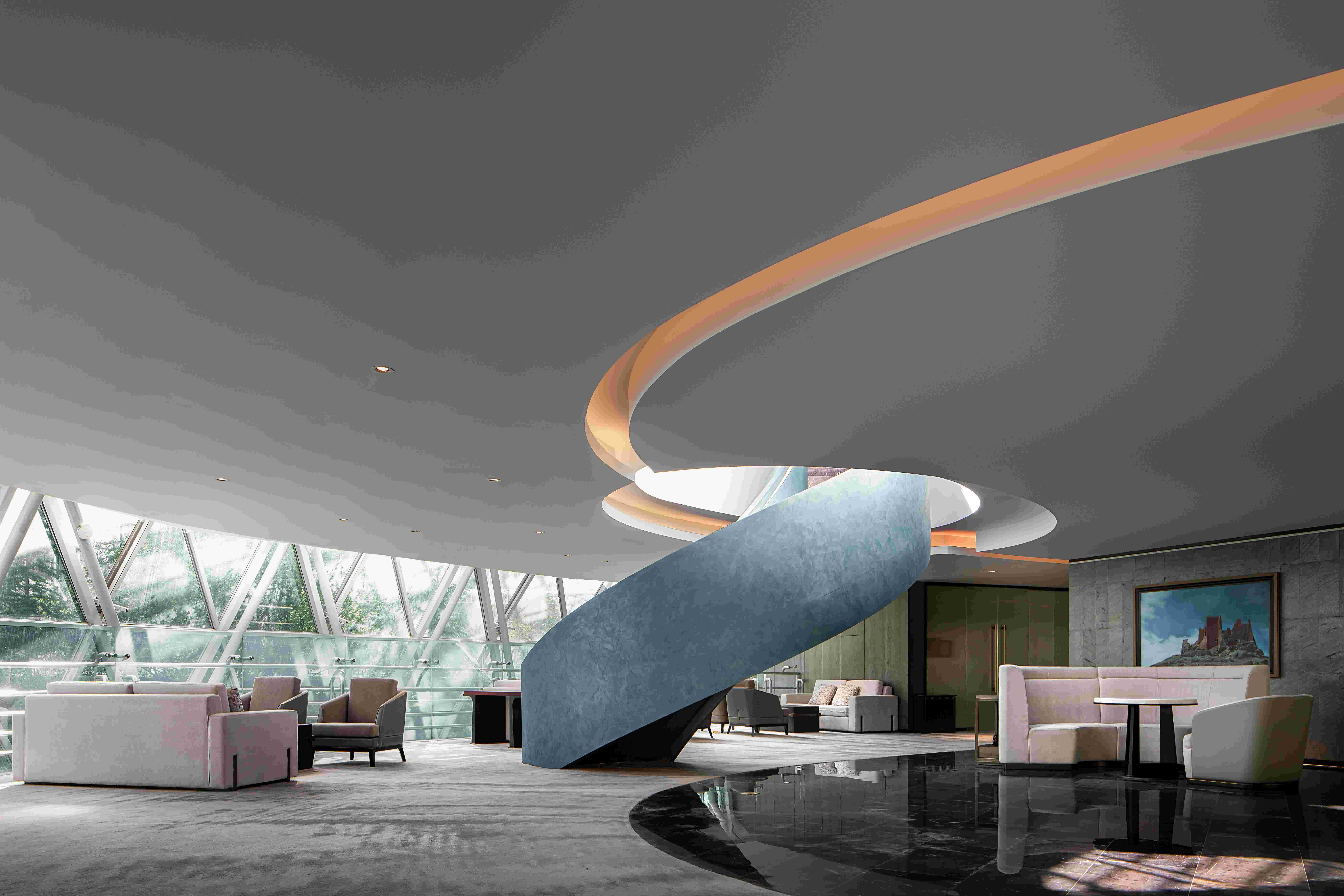 ▲ Check in 等候區(qū)及通往行政酒廊旋轉(zhuǎn)樓梯