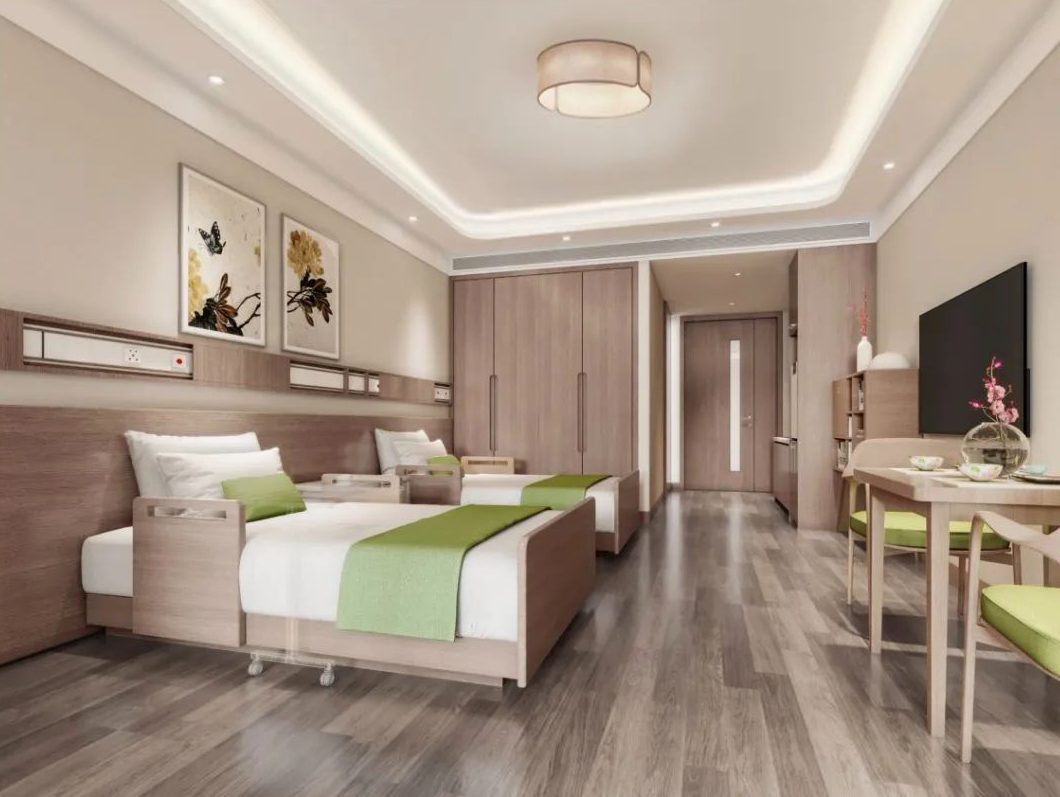 我們將山水元素作為整個空間的鋪墊,并以椿樹和木槿花作為核心元素,貫穿整個空間設(shè)計中。其中椿樹主要寓意健康長壽,木槿花主要指絢麗綻放,溫柔的堅持,它代表著紅火,象征著念舊、重情義,整體表達(dá)老人的身體層面和精神層面。