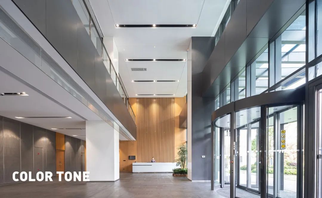 再次,在色彩的應(yīng)用上,以淺色系與建筑主體色調(diào)相結(jié)合,共同構(gòu)成室內(nèi)色彩基調(diào),并重點(diǎn)體現(xiàn)企業(yè)的文化背景和企業(yè)精神。