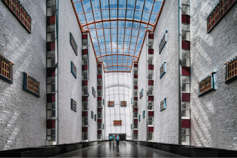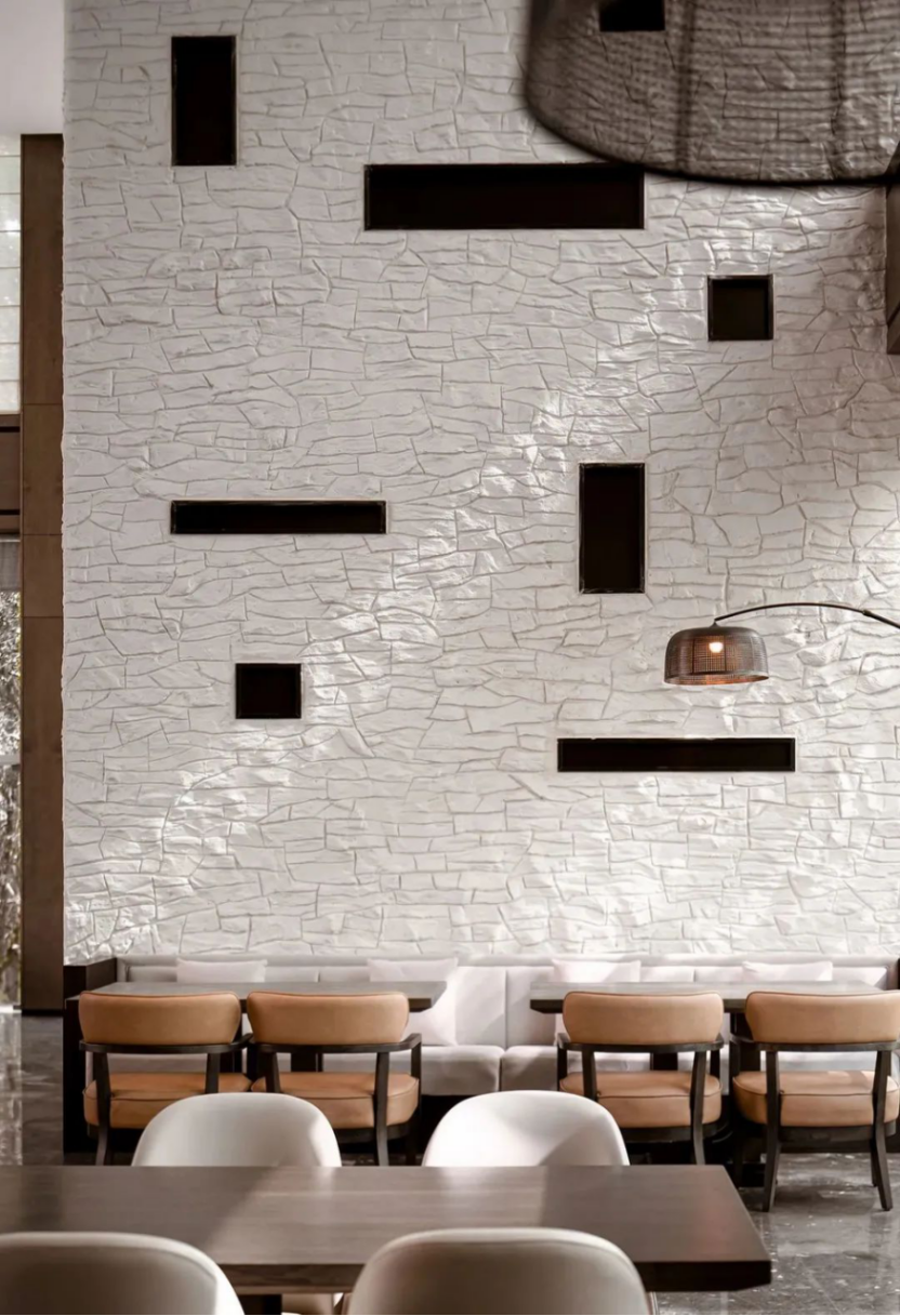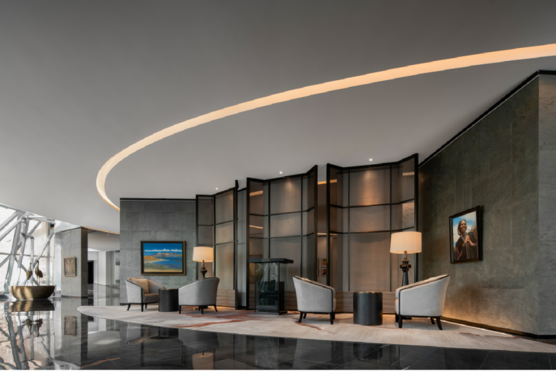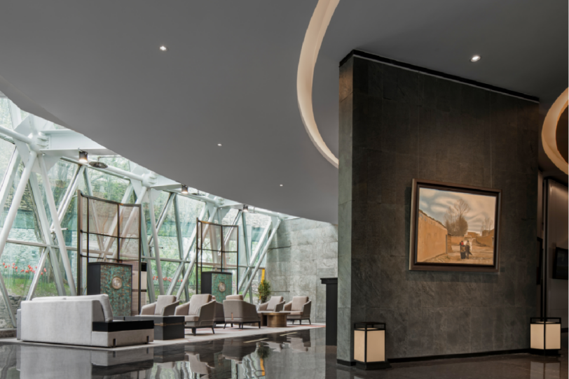 接待大堂江河設(shè)計(jì)JHD希望將故事從自然生態(tài)過渡到對(duì)于迷人的地域風(fēng)情。通過對(duì)當(dāng)?shù)氐某浞终{(diào)研,江河設(shè)計(jì)JHD保留了藏式迷人的色彩印象,用當(dāng)下工藝去詮釋藏式的邊瑪墻、融合極具天然質(zhì)感的薄石材板,同時(shí)將地域元素、文化進(jìn)行提煉整理點(diǎn)綴到空間中。同時(shí)創(chuàng)造性在首層接待大堂空間中置入畫廊,畫廊中的畫作均為藝術(shù)家為酒店創(chuàng)作的系列作品,將酒店的歷史風(fēng)貌及地域風(fēng)情展示出來。