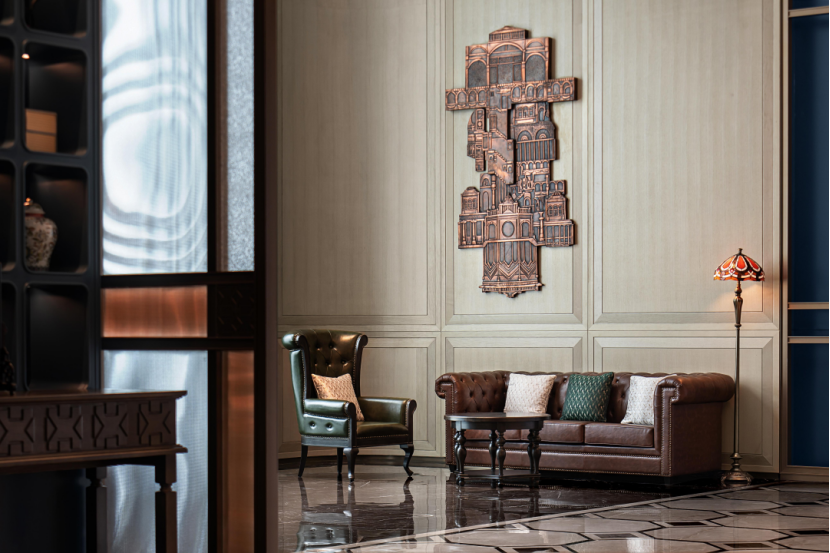 通過富有時(shí)代感彩色玻璃序列組成的三進(jìn)院空間,這里的設(shè)計(jì)呼應(yīng)中國(guó)傳統(tǒng)宅邸院落式布局的設(shè)計(jì)手法,層層遞進(jìn)后那復(fù)古的時(shí)鐘又再一次提醒人們這里是“民國(guó)”。接待區(qū)是整個(gè)三進(jìn)院空間的一個(gè)變奏,在這里深色的木質(zhì)線條從墻面延伸至天花,細(xì)細(xì)彩色的玻璃窗,由皮箱的組成的接待臺(tái)后面穿著旗袍的女士在靜靜等候著游子的歸來。