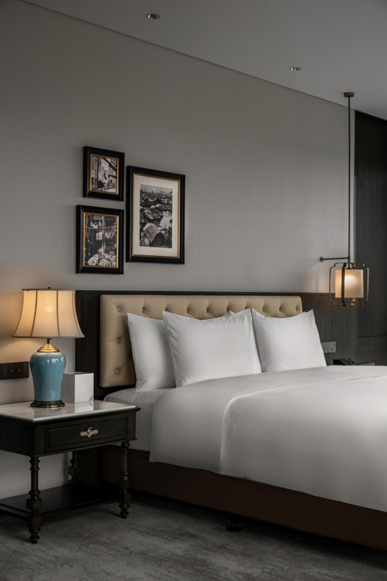 彩色的玻璃窗、復(fù)古的老照片及老物件,精致的西式線條貫穿整個(gè)酒店的始終。進(jìn)入客房首先映入眼簾的同樣是具有時(shí)代感的彩色玻璃,同時(shí)墻面的西式線條搭配中式家具,同樣訴說著古老東方與西方的相遇。