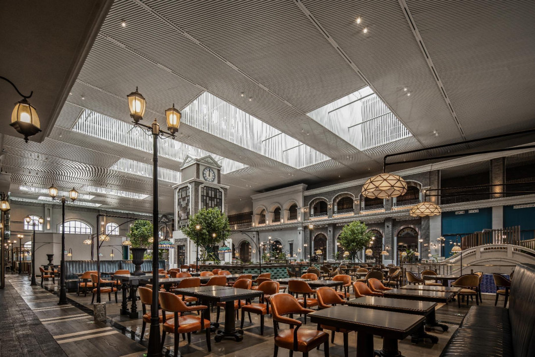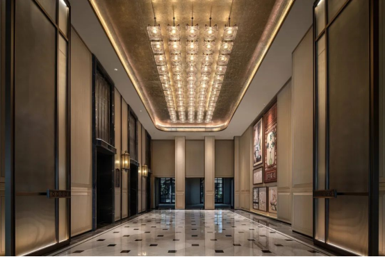 鐘樓做為民國(guó)時(shí)期市中心的一個(gè)重要地標(biāo),被運(yùn)用到共享大堂的中心廣場(chǎng)位置,廣場(chǎng)的設(shè)計(jì)是民國(guó)時(shí)代的城市建設(shè)縮影,共享大堂做為施柏閣大觀酒店與皇冠酒店的大堂吧及全日餐使用,立面上使用軟磁材料,塑造民國(guó)風(fēng)立面,打造民國(guó)街區(qū),伴隨著悠悠的鐘聲將人民帶回那個(gè)激蕩而浪漫的年代。