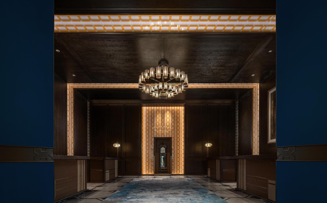 接待區(qū)是整個(gè)三進(jìn)院空間的一個(gè)變奏,在這里深色的西式墻板從墻面延伸至天花,彩色的玻璃窗,由皮箱的組成的接待臺(tái)后面穿著旗袍的女士在靜靜等著的歸來(lái)。