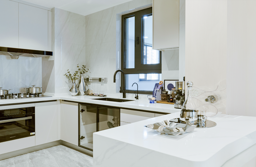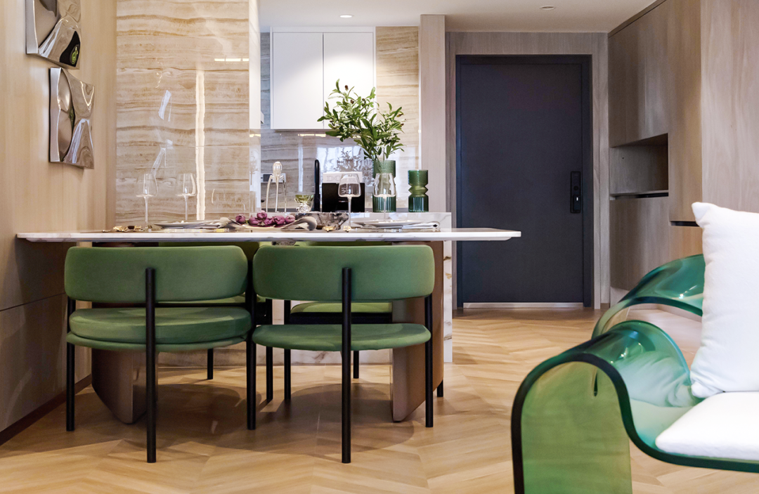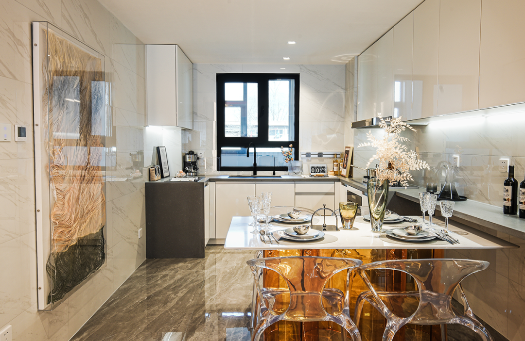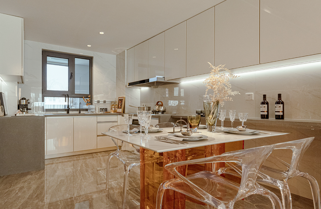 透明水晶餐椅,懸浮式餐桌,還有各色的玻璃器皿,讓餐廚空間視覺上被放大的同時(shí)增添現(xiàn)代家居的溫馨藝術(shù)就餐氛圍。