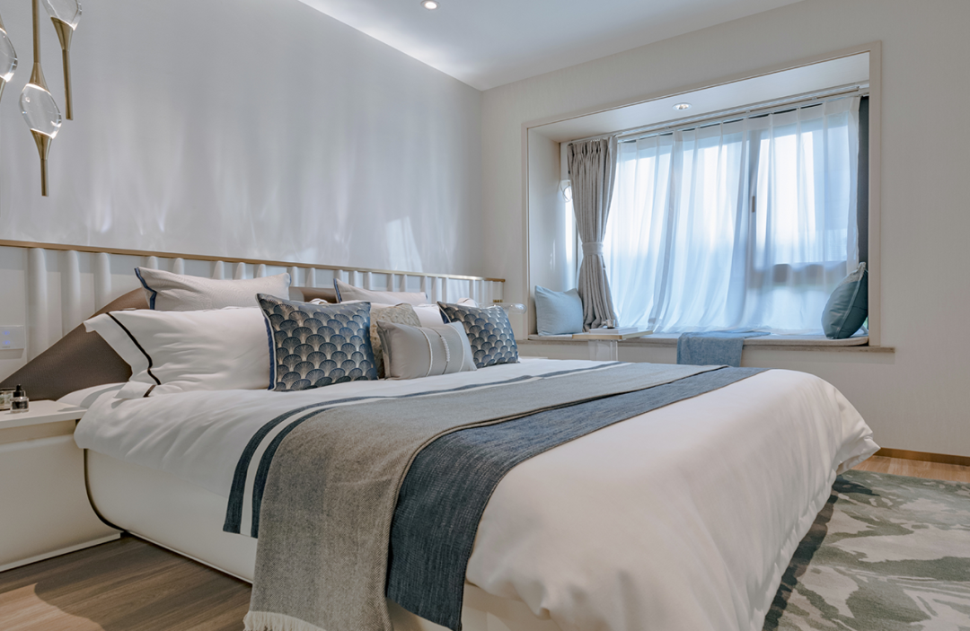 整個(gè)空間以藍(lán)色為主題,通過柔軟觸感的織物沙發(fā)、床品來柔軟藍(lán)色的冷調(diào),通過銀色的飾品,水晶燈的裝點(diǎn),實(shí)木的溫潤觸感,都讓整個(gè)空間既有優(yōu)雅的紳士品味,同時(shí)也兼具謙謙君子的溫潤如玉的品格。