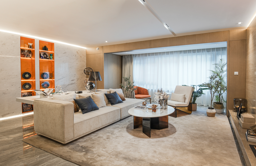 開放的客餐設(shè)計(jì)放大整個(gè)空間,簡潔考究的金屬色家居,在細(xì)節(jié)中展現(xiàn)完美,適時(shí)擺放的綠植,鋪陳的淺色系紋飾地毯,嵌入式橙色展示柜都是整個(gè)空間優(yōu)雅明亮的設(shè)計(jì)點(diǎn)睛之筆。