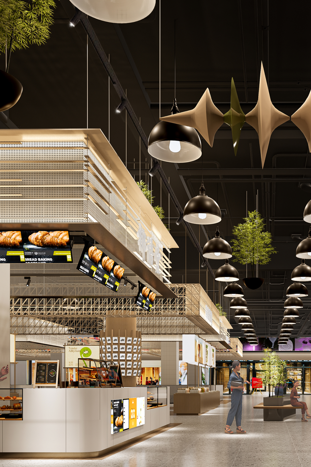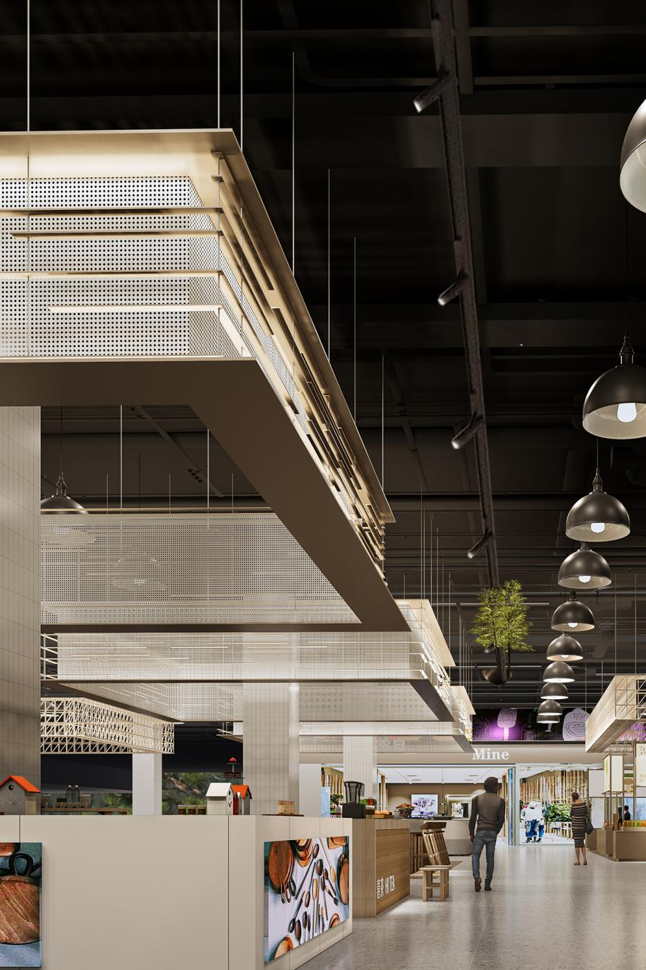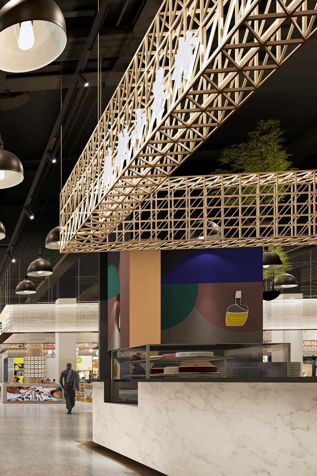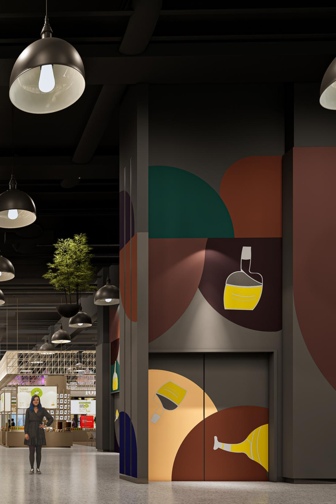 設(shè)計創(chuàng)造類似街頭市場的戲劇體驗。雙層結(jié)構(gòu)的美學(xué)讓人塑造了空間的層次,其材料由裸露混凝土、鋼材和暴露的裸頂組成。利用空間高度,創(chuàng)造視覺焦點,同時二層融入場景化的裝飾是強化市集體驗感的關(guān)鍵元素之一,強化藝術(shù)繪畫的形式豐富空間的層次,立面圖案營造使裸頂設(shè)計顯得不那么單調(diào),創(chuàng)造視覺焦點,使場景更加有活力。