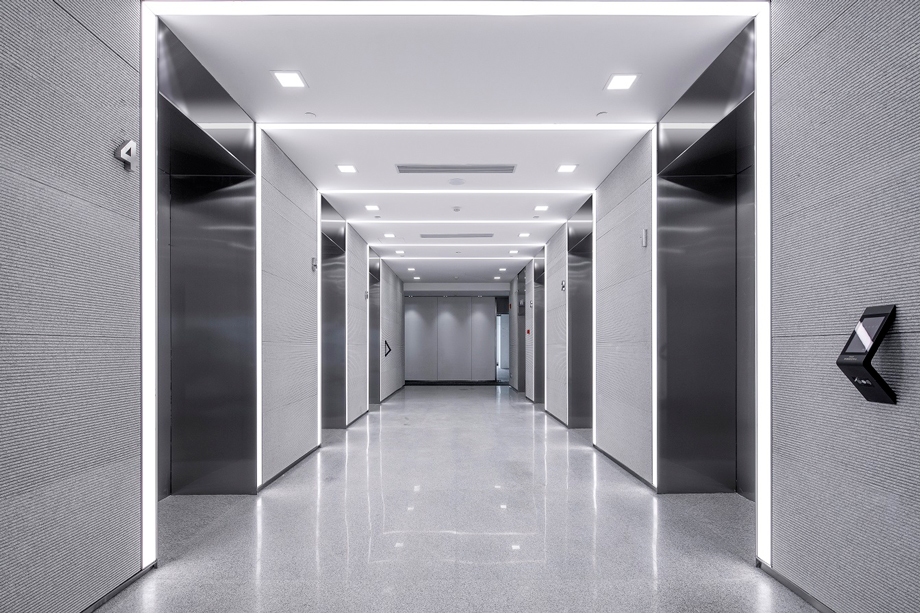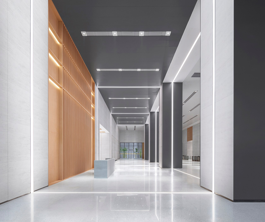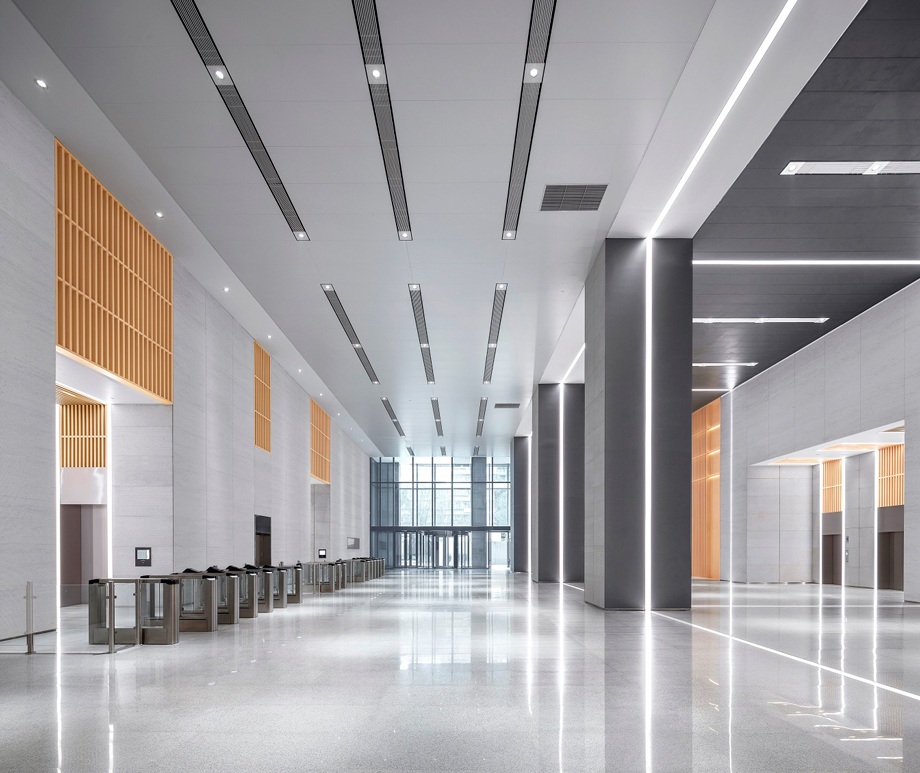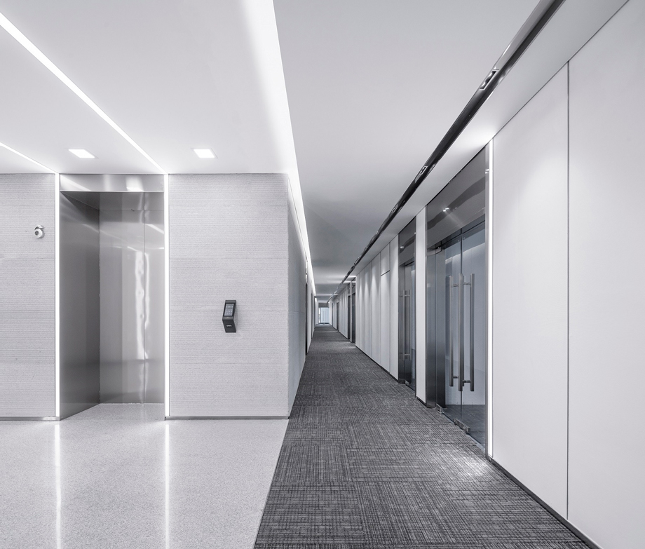 Themed as lines of light, the design of indoor public areas in the office building combines organically the linear light and neoclassical architecture, creating a modern, simple and practical indoor environment.
