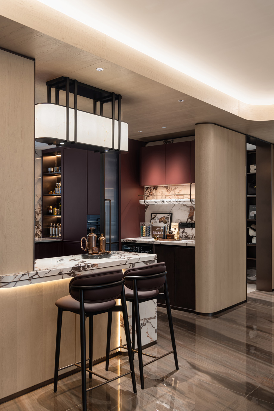 靜雅棕巖板地面如大地脈絡(luò),木飾面墻面與寶格麗紫巖板島臺(tái)碰撞出戲劇張力。