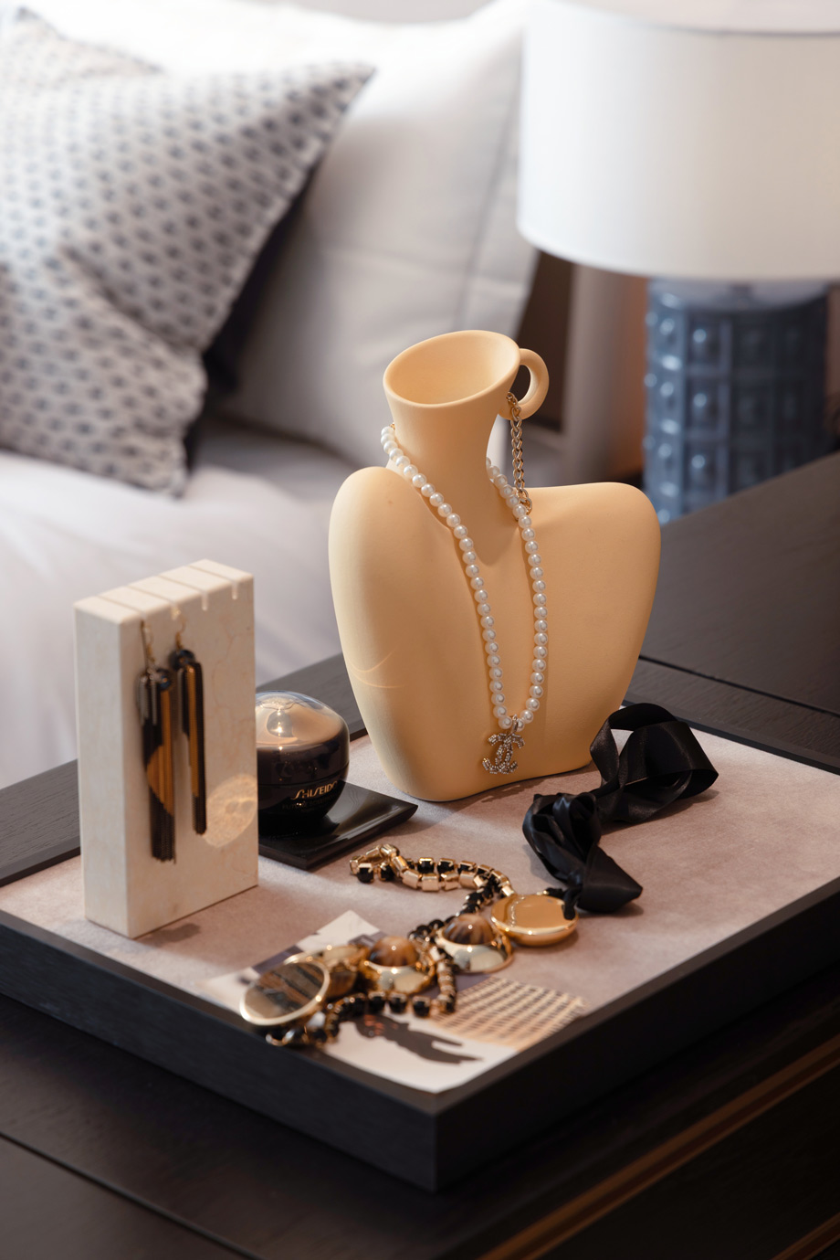 L形轉(zhuǎn)角衣柜以皮革與金屬鑲邊,兼具收納與展陳功能;飄窗臺(tái)化身迷你茶席,晨光微曦時(shí),一杯清茶、一本閑書,便是詩意生活的注腳。