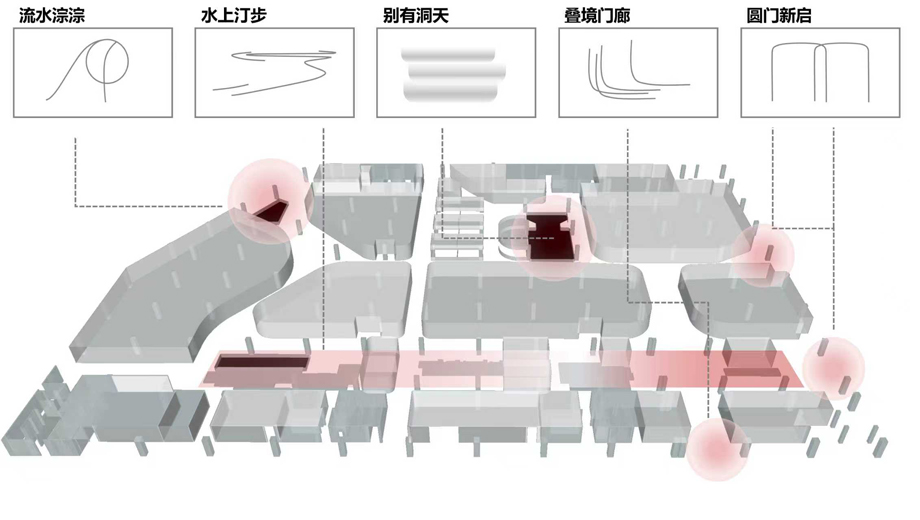 在室內(nèi)空間的打造中,從天花、中庭、中島、門廊、門頭等不同區(qū)域入手,精心營造了“流水淙淙”、“水上汀步”、“別有洞天”、“疊境門廊”、“圓門新啟” 五大主題場景。