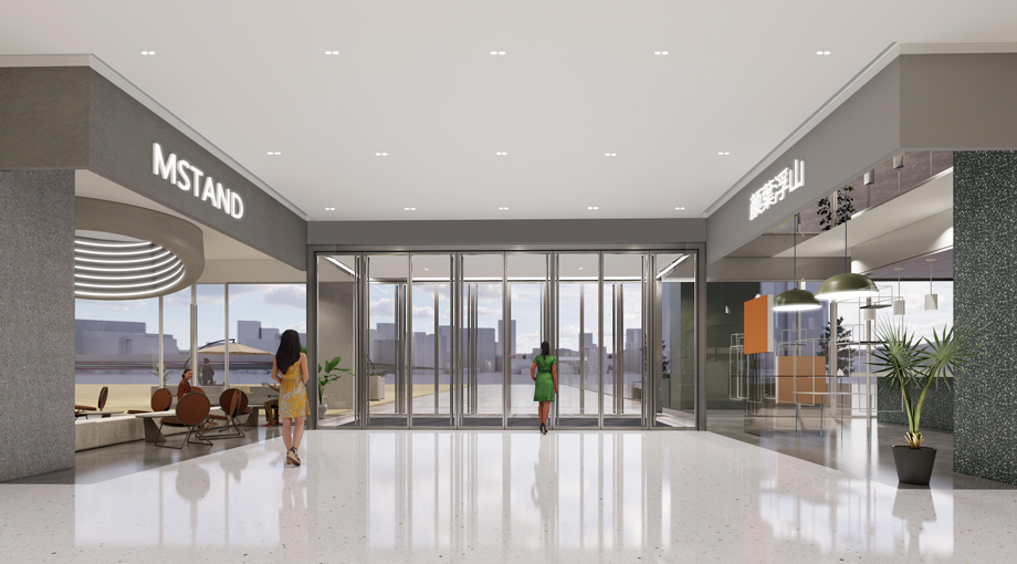入口區(qū)域以“疊境門廊”為設(shè)計主題,通過層疊的綠植墻與流線型的門廊造型,模擬山巒起伏的自然景觀,給顧客帶來強烈的視覺沖擊與空間層次感。