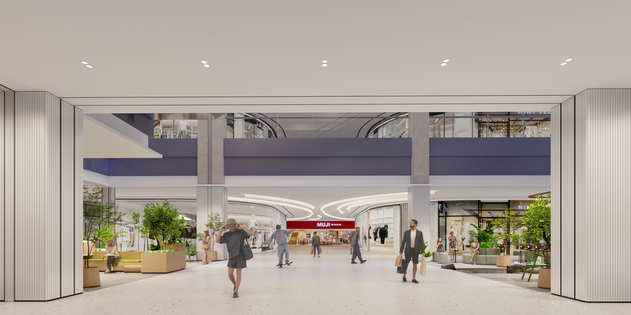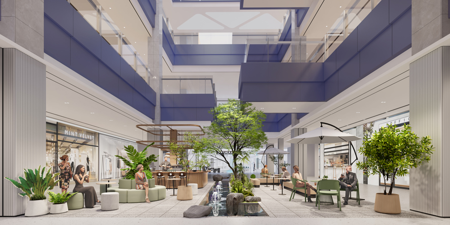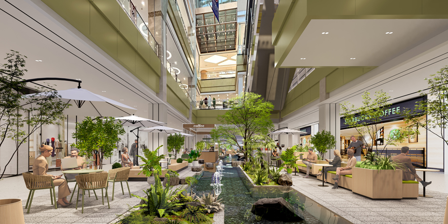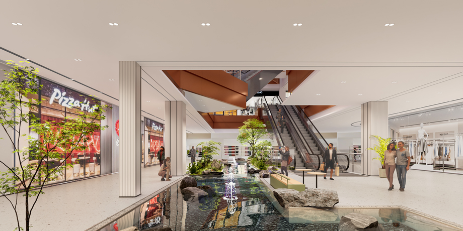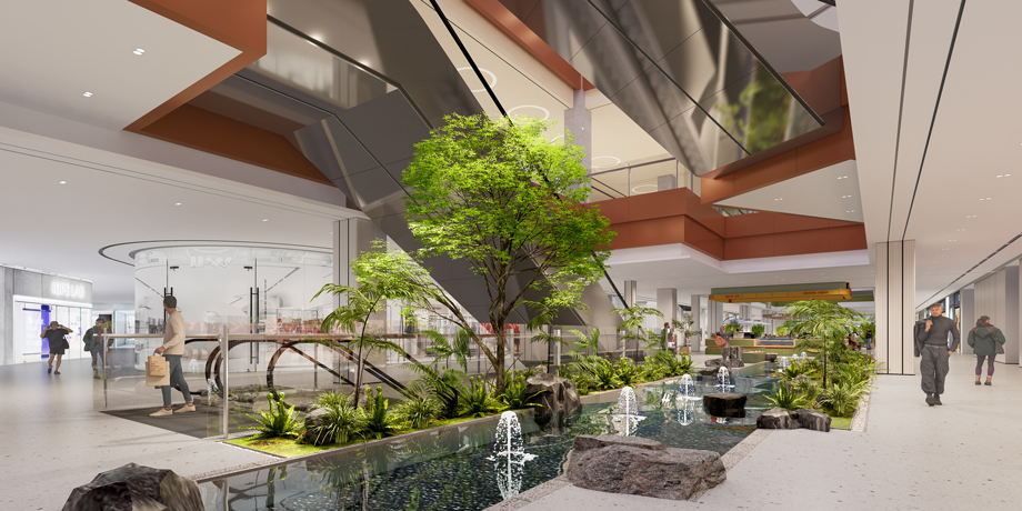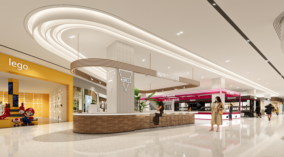 在中庭空間的改造設(shè)計中,天花采用流線型設(shè)計,模擬山丘的等高線形態(tài),賦予空間以動感和層次感。這種設(shè)計不僅美化了視覺效果,還引導(dǎo)顧客的行走方向,增強空間的導(dǎo)向性。