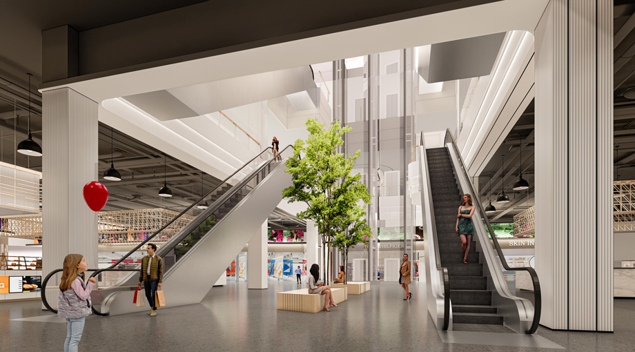 新舊交接區(qū)作為改造項目的關(guān)鍵部分,采用霧面灰香檳色金屬波浪板、不銹鋼等現(xiàn)代材質(zhì),結(jié)合燈光設(shè)計,實現(xiàn)新舊空間的自然過渡與和諧統(tǒng)一。該區(qū)域的設(shè)計既保留了原有建筑的韻味,又注入了現(xiàn)代商業(yè)的時尚元素。