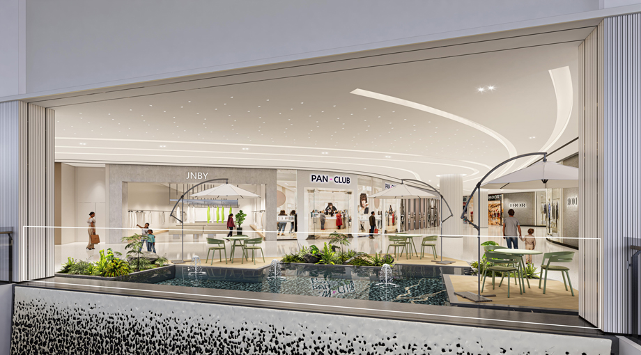 門廊兩側(cè)設(shè)置互動式水景裝置,結(jié)合昆明“水城”特色,讓顧客在入門瞬間即感受到自然的靈動與活力。