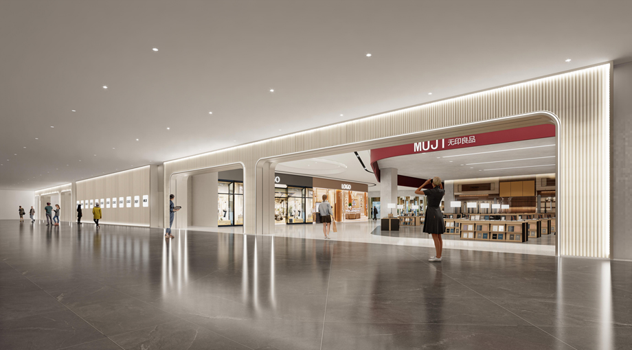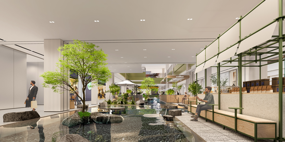標(biāo)準(zhǔn)商街與特色商街的設(shè)計注重與昆明本地文化的融合。商街立面采用仿水磨石瓷磚、霧面灰香檳色鋁板等現(xiàn)代材質(zhì),結(jié)合云南蕨類植物等自然元素進行裝飾,營造出一種既現(xiàn)代又充滿自然氣息的商業(yè)氛圍。